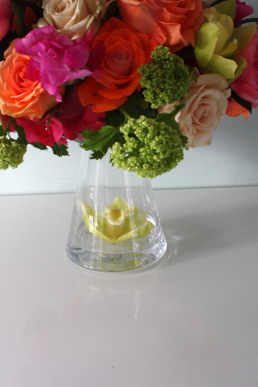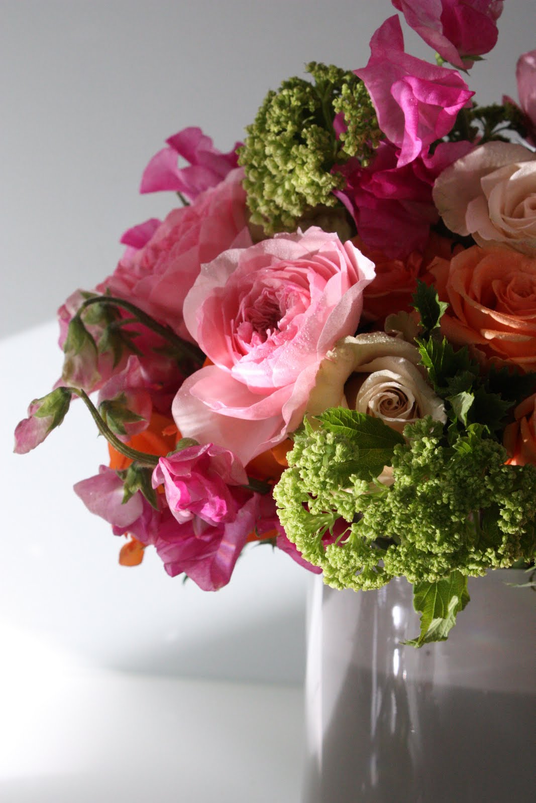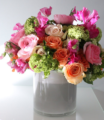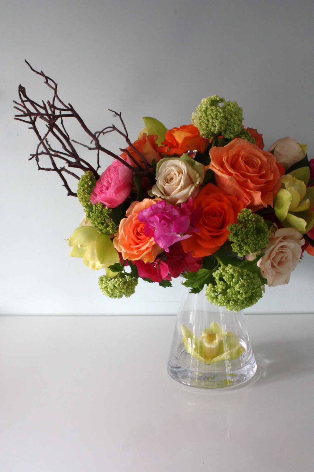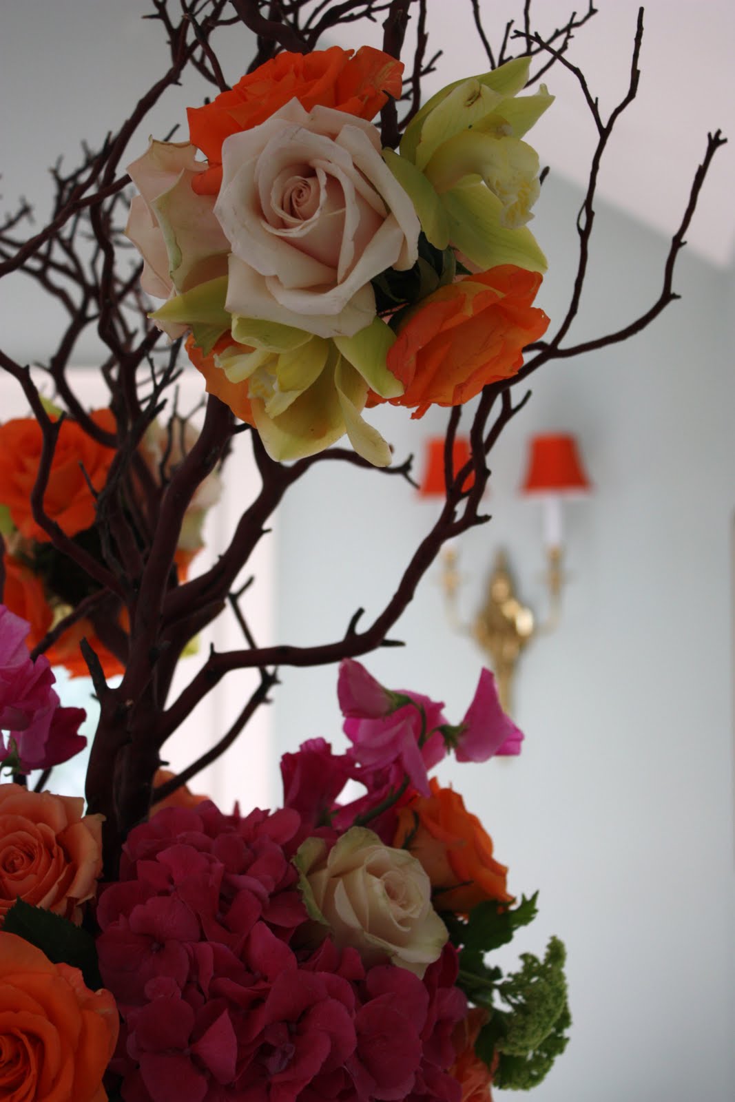 Yesterday I created two mock centerpieces, a Tall Arrangement featuring Manzanita Branches and a Low arrangement to complement it for an April Bride. She wanted lots of Vibrant colors with a fresh spring look. Viburnum, Sweet Peas, Roses and Hydrangea were featured.