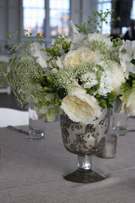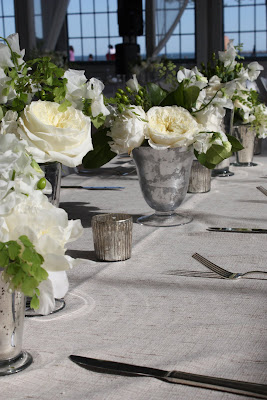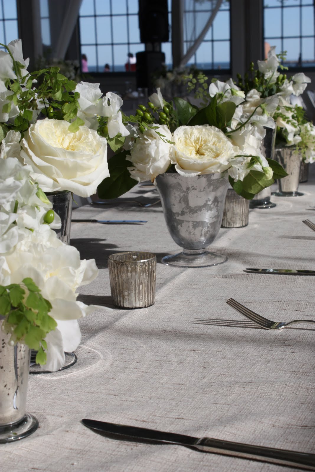 This past weekend the studio created a white and green wedding in the Pavillion at Lighthouse Point Park in New Haven. The Pavillion is an old building set right on the beach complete with a beautiful Carousel inside! A mix of Rectangle and Square tables were dressed in linen colored linens. Mercury Glass vessels lined the tables. Peonies, Garden Roses, Queen Anne’s Lace , Maidenhair Fern and other seasonal flowers were featured in garden style arrangements. Sunset colors of Corals, Pinks, Peaches and Yellows were featured for the cocktail hour and placecard table.