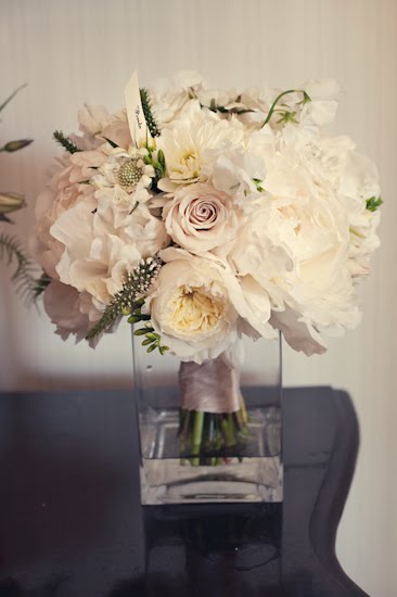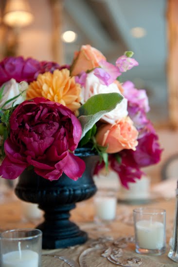 Peonies, Dahlias, Roses, Ferns and other fun elements were used to create a textural and whimsical feel. Black pedestal urns and ceramic containers were used for centerpieces.