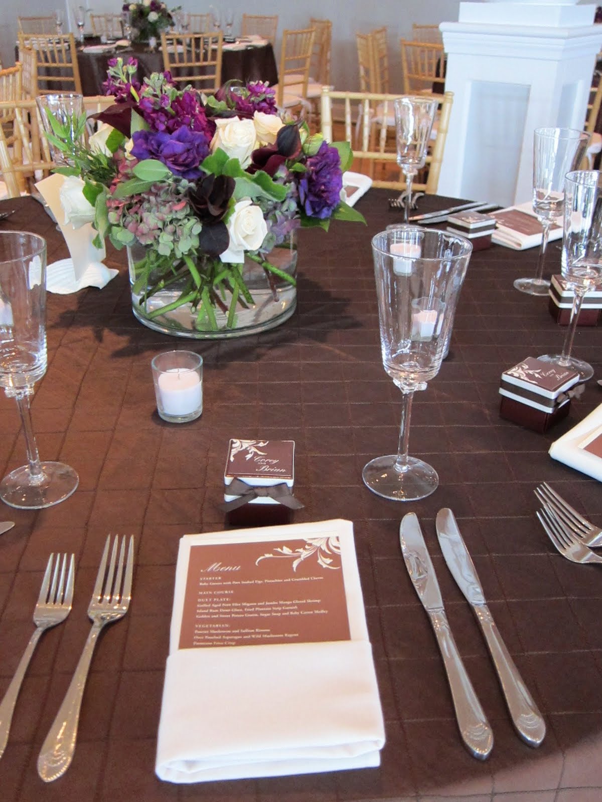 Yesterday the team at Blush floral studio designed a wedding at the Guilford Yacht Club featuring rich shades of purples and chocolate browns. The centerpieces featured different shades of purples including Antiqued Hydrangea, Lisianthus, Calla Lilies, Geranium Leaf and Stock. The Chocolate Brown linens created a rich look perfect for Autumn!