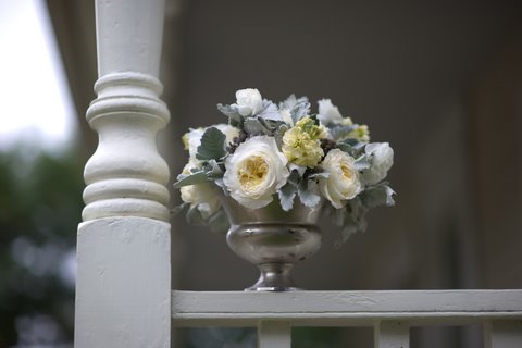 As the weather gets colder outside winter white flowers with soft dusty blues and greys become a popular choice for the season. Here Patience Garden Roses, Cream Stock, White Ranunculus and Dusty Miller are arranged in a silver pedestal bowl…