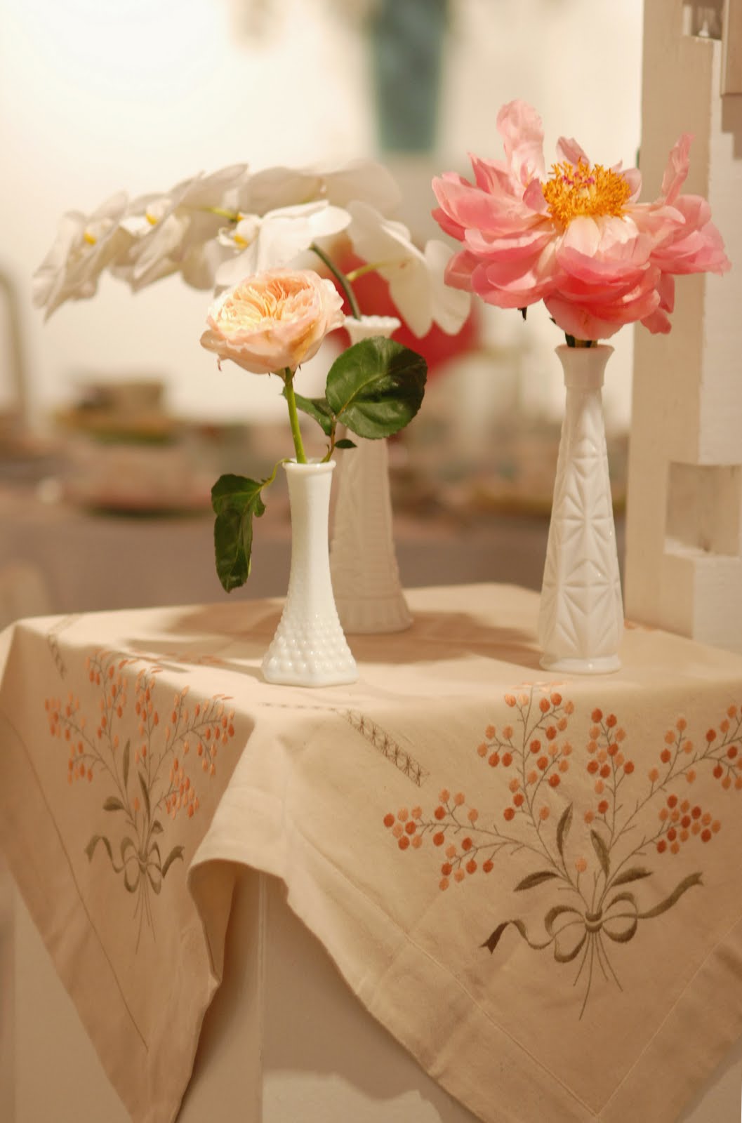 Bridal Showers are such a great time to decorate with all things girly and pretty. Below are pictures from my own bridal shower which took place at the Guilford Art Center this past summer. My amazingly creative mom and good friend Lauran, who both are designers at Blush studio, transformed the blank space and put together the most amazing day for me. They ordered their own ‘top secret’ box of flowers from my wholesaler and used leftover blooms from the wedding we setup the day prior. Mismatched Antique china place settings adorned each table, bright colored paper lanterns hung from the ceiling, an old garden cart was used to collect gifts, and almost all the delicious and beautiful food was homemade by my mom and friends.