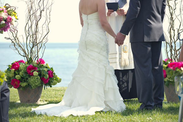 Brooke and Steve planned their gorgeous wedding at this amazing old beach house on the water in Westbrook, the location and weather was perfect for their June wedding. Brooke was all about featuring bright colors and embracing the start of summer. Bright Watermelon Pink Peonies with yellow and green accents were the feature flower of the event. We filled wire baskets lined with moss and wooden boxes and incorporated lots of greens and kiwi vines to keep a casual feel to the event. Carla Ten Eyck and her team took the gorgeous pictures!