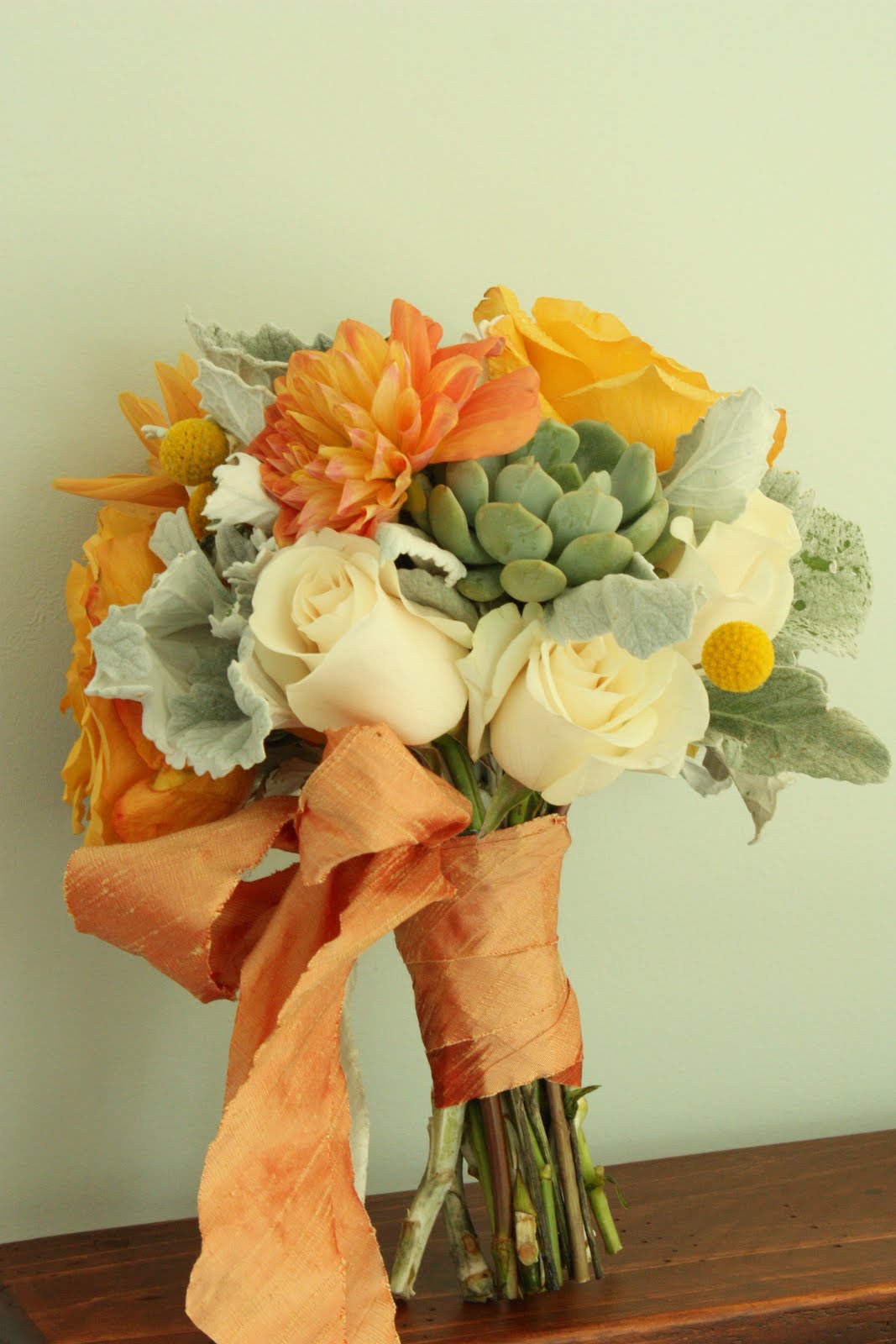 This gorgeous combination of mustard golden Yellow with the silver blue and creamy ivory is a little more subtle and sophisticated than the traditional Fall shades of Orange, Reds and Yellows. Succulents, Craspedia and Dahlias give great textures. So soft and pretty!